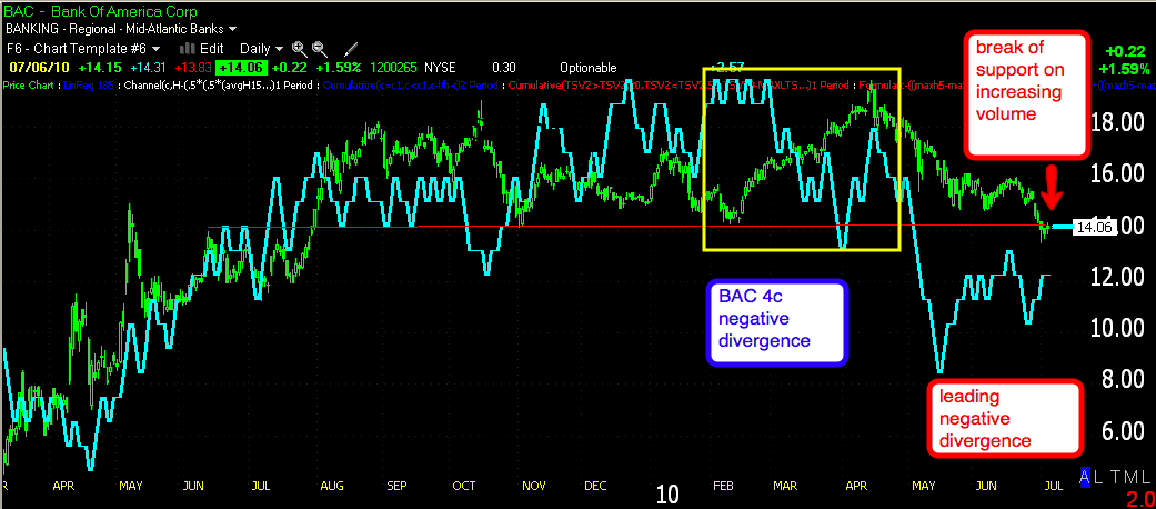 The extended trading range shows a daily 4C negative divergence that turns into a leading negative divergence, shortly thereafter BAC breaks very significant support in the $14.40 area. The longer support stretches, the more times it is tested, the more significant the eventual break. We now have approximately 11 months of long positions underwater (Overhead Supply/Resistance).
