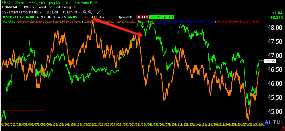 The 10 min chart does chow accumulation and it's exactly where it was found in the SPY, DIA, QQQQ and IWM-late Friday afternoon last week. If you refer back to the first chart at the top, you will see that the accumulation on Friday also is right at the top pattern's last ditch support level so it's not so strange to see a bounce off that support level as it is now the most meaningful level on the chart.