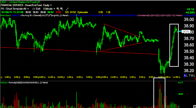 Check out the volume on the break of support, the following near vertical price action is typical of short covering, perhaps the shorts jumped in on the break of support, perhaps that's all USO needed, but I think there's still more drama coming.