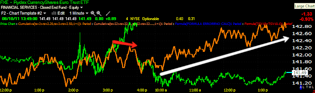 In white, the FXE/green the SPY. Note the correlation between the two represented by the red trendlines.