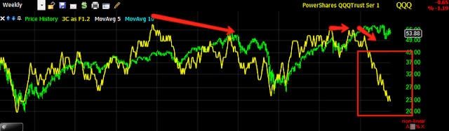 Here's the DIA going back to the March 2009 bottom , the second set of arrows from the left are the end of QE1 and after the announcement of QE2. Now we have a fairly strong 3C reading as well as in the depth charts, but I started talking about this before I created the depth chart, it was apparent on 3C alone. I speculated that we'd most likely make a new low and then see an extended rally, the duration of which would depend on what the catalyst was. I had mentioned QE3 in a tongue and cheek manner, but I was certainly hinting at some sort of FAD policy as that's about the only thing that has moved the market up since March 2009.