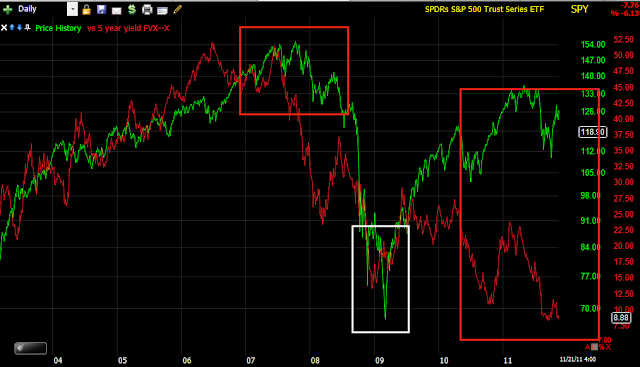Slightly longer term, but still intraday, here is the disconnect with the Euro still far below equities, remember the typical correlation is a 1 pip move in the Euro= 2 Dow-30 points. I have to see how far above the correlation the Dow is, but I'm fairly sure it's over 500 points rich.