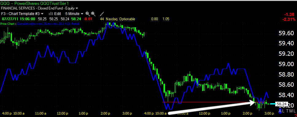 As for today's dominant Price/Volume relationship, it is easily Close Down/Volume up for all of the averages. There's a dual edge to this relationship, it can be a sign of a serious break in the market and it can be a sign of a serious oversold condition. Since we are so close to the 50-day moving average, we cannot rule out either possibility. The divergences that formed earlier today weren't strong, only on the 1 and 5 min charts with one exception, these are usually little more then a 1-day bounce. However, such an overwhelming P/V relationship in such proximity to the 50-day moving average can set up a nasty bounce up although it doesn't look or feel that way now, we must reman open to the possibility of this happening even if it is remote.