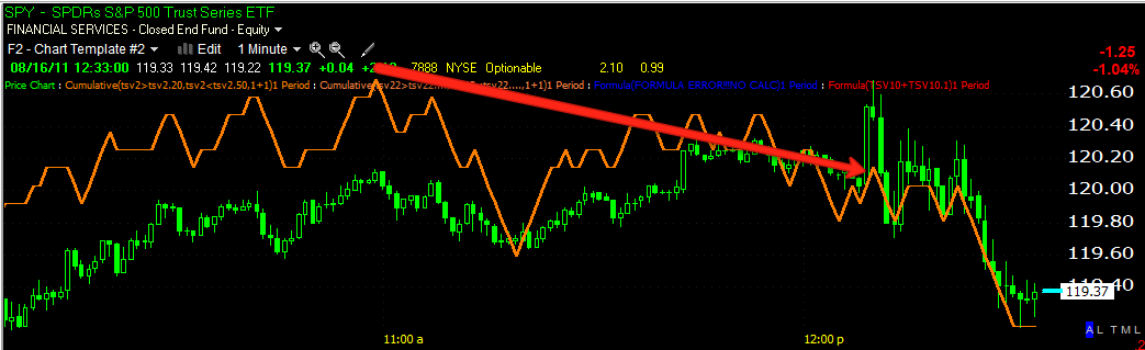 This is the 30 min 3C chart of ERY or "the big picture". You can see accumulation in July, confirmation of the rally in August (green arrow) and distribution on a parabolic spike in August (red arrow), then confirmation of the downtrend (green arrow). There's no positive divergence on this chart, so the move up in ERY, which I believe is coming, is not going to be as big of a move as the two previous moves up and down.