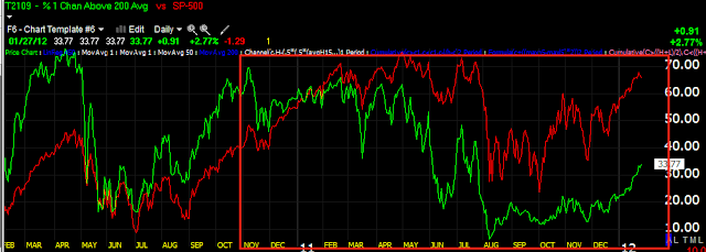 % of stocks 1 channel above their 200-day moving average. Clearly this metric (green vs the SPX red) deteriorated during the 2011 top, it hasn't recovered during this move.The same indicator, except it uses 2 channels above the 200 day moving average shows the picture in even more extreme terms as the market has rallied on thin breadth.