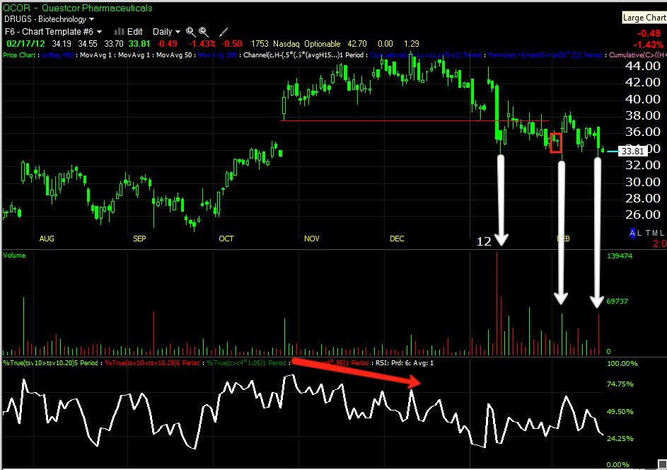 At the white arrows we see areas of either candlestick hammers , doji's or long lower wicks (short term reversal candles) all on volume. Whenever you see a reversal candle on heavier then normal volume, you usually get a little bounce and since we want to short in to strength, yesterday's 4+% decline on volume, leaving a long lower wick opens the possibility of a little bounce, giving you a better risk:reward entry.