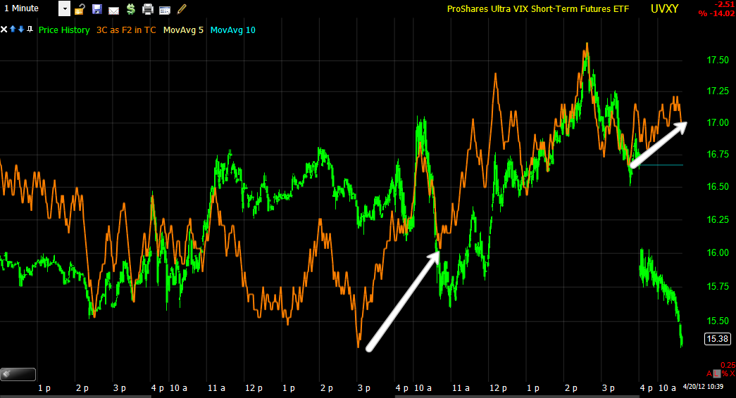 As mentioned, the 2 min UVXY is not seeing the positive divergence develop here yet.