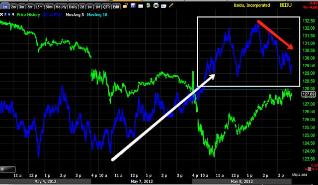 The 15 min chart in BIDU would normally suggest to me the move below that small April consolidation was indeed a head fake move to trap shorts for a squeeze, since I feel confident in the long term assessment of BIDU, I will not be trying to trade around and instead hold my position and look to add to it on strength.