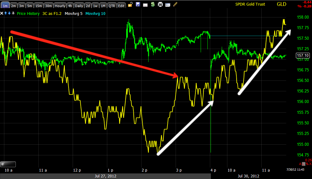 The next timeframe, 3 min IS NOT seeing any of the migration of the 1 min positive divergence, this will be something I'll be looking for and a chart I'll be watching closely. The highest probabilities are still for GLD to pullback, but we do have the start of a new and interesting trend, it's just a start, but worth keeping a close eye on.