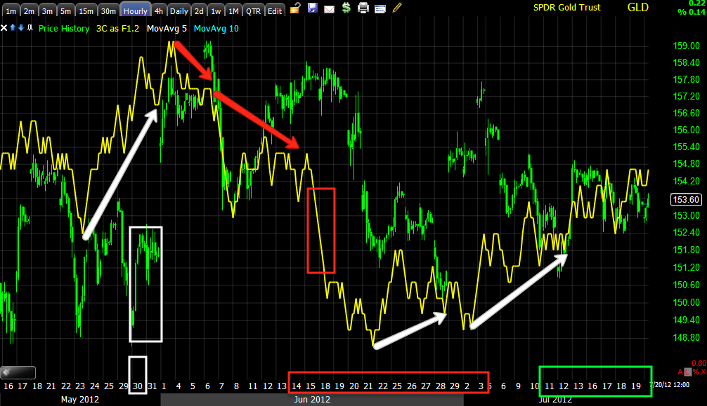 The 30 min chart is also shaping p since looking pretty negative and showing a head fake move July 3rd in to distribution. This 30 min chart has a little bit of a leading positive component to it, thus it looks like we are going to see a directional move higher in GLD, I'm just not quite ready to commit to a trade there yet.