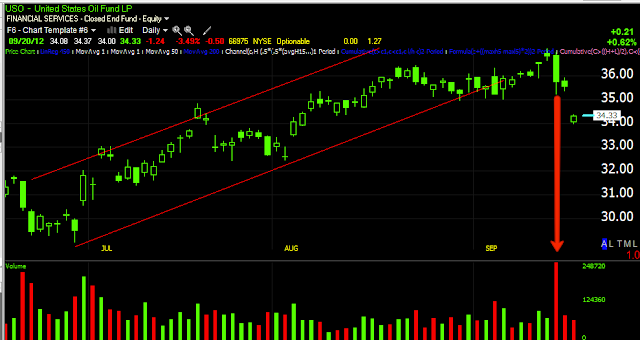 The hourly chart seems to support a more pessimistic longer term view of USO, but that is over many months and needs to be confirmed still with the recent QE3.