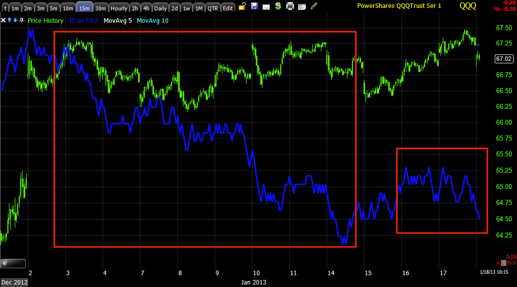 Here's the volatility ETF for short term VIX futures, VXX. Below is the 3C depth chart, it is more or less the difference between 3C and price which can be skewed at times due to scaling. When the bottom indicator is making a deep crest like we see at the yellow box, that is typical of distribution areas, when it makes shallow troughs, those are consistent with accumulation areas, the size or difference between the far left and far right are important.