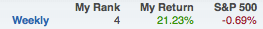 #4 of 328 with a 21+% return for the week on the overall options tracking portfolio (I say tracking because I use it to track various positions, it's different than a trading or "model" portfolio as I would not trade all of the ideas that I put out for our various members because of excessive correlation, too much open market risk and other issues that are not favorable for model portfolio performance).