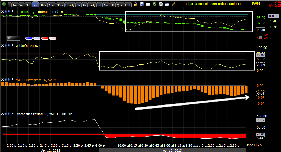 1 min momentum IWM -MACD is improving, maybe Stochastics, RSI is improving and momentum in the top window is improving. We should see that migrate as well to say the 5 min chart below.