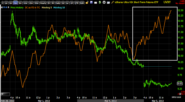 While UNG didn't have much time to work on that migration as the 1 min chart went positive around 2:45 p.m., it did make it far enough along to put the 3 min chart in line, so the move so far is of to a good start.