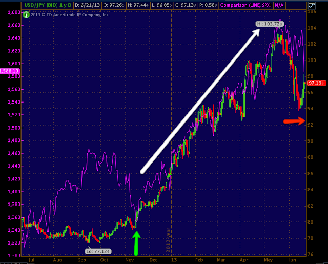 The green arrow is the November 16th SPX(purple) lows. Note the correlation was certainly there, but not as close as the USD/JPY.
