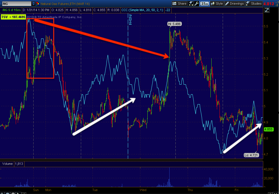 The 15 min chart is very interesting because I have mentioned several times how the futures version of 3C (above) differes from the equities version in timeframes so the timeframes shouldn't be compared in the same manner. Look at the 3C divergence on the 15 min NG futures and next...