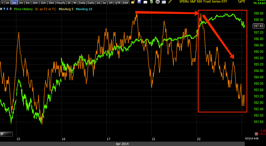 This 3 min chart shows the same negative distribution on the gap up, but take a closer look at intraday activity on the same chart below...