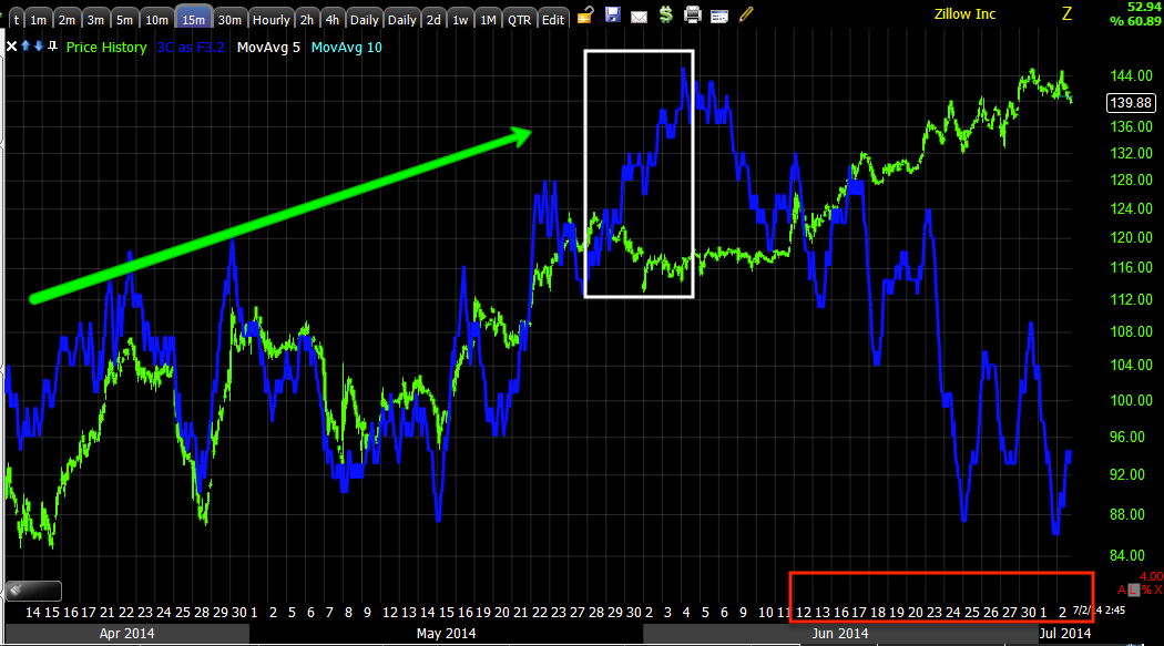 MCP's longer term 30 min positive divegrence with our last trade at A when $2.50 was broken, we had a +12% gain the next day in equity longs and a call position that was in the double digits closed the same day. At #2 I was looking for a stop run under $2.40 and potentially another call trade, but the short term charts didn't give a strong signal like at #1, however as I was watching today, I came close to looking at a call trade at #3, here's the intraday action below...