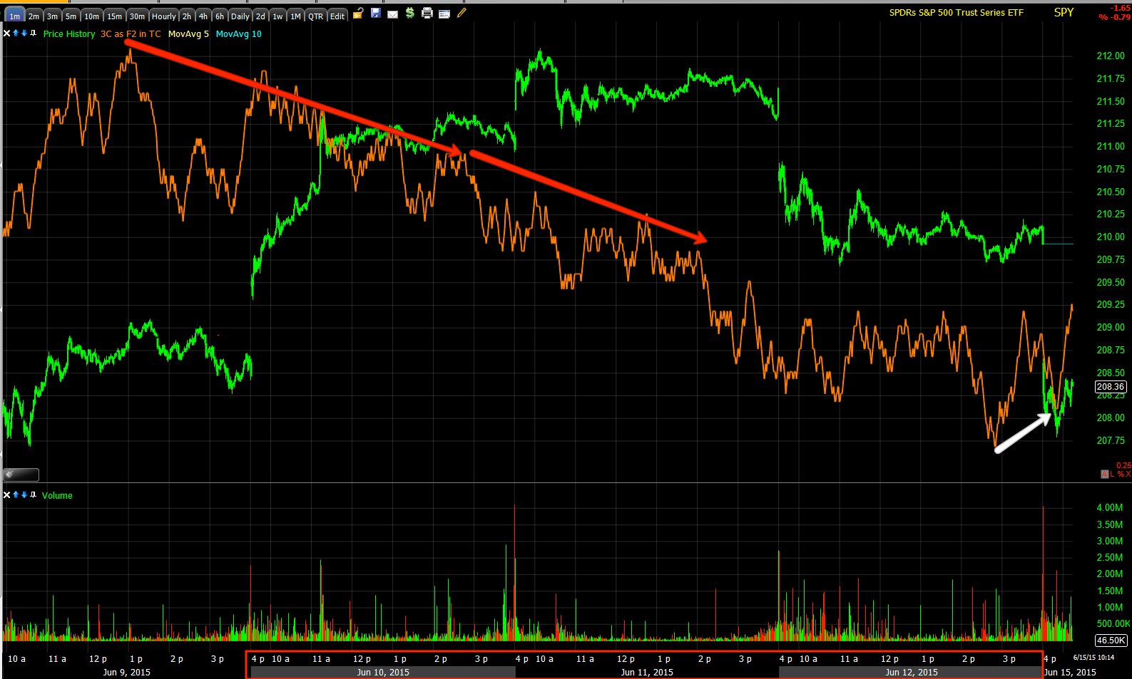 SPY 1 min leading negative at the 3-day candlestick reversal price pattern with a very small intraday positive to the far right, likely indicative of some intraday support at the 150-day m.a.