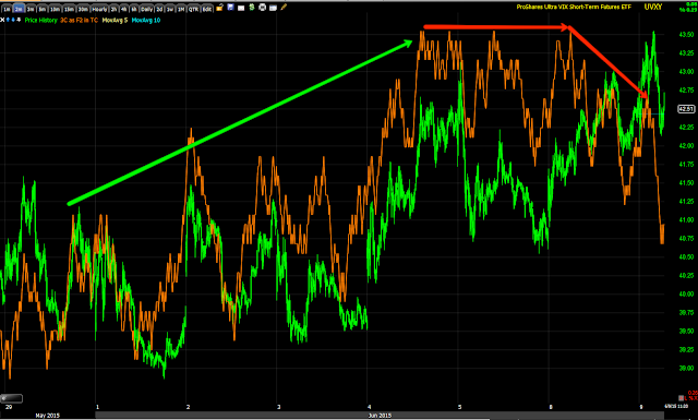 UVXY, the 2x leveraged long ETF-(VIX short term futures) is also showing the same 2 min negative divergence and confirming both VXX above and SPY above as some market strength is starting to take hold.