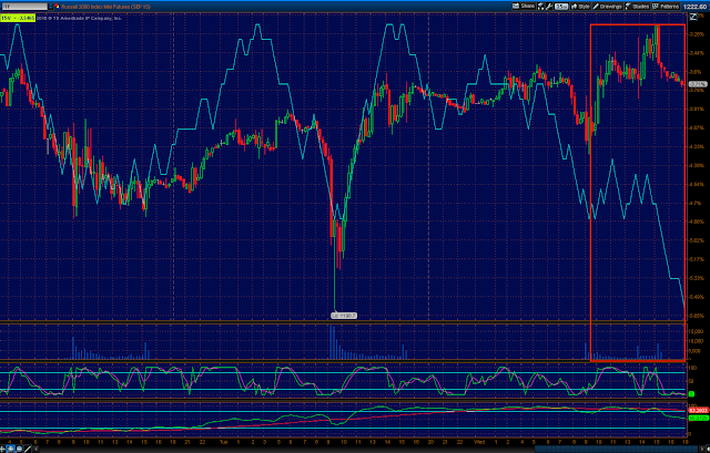 It may be hard to see, but Russell 2000 futures which never went positive for this bounce which is one of the strange things I noted early in the week (the difference between the averages like SPY, QQQ, IWM and Index futures). However post F_O_M_C the 5 min chart is leading negative even worse.