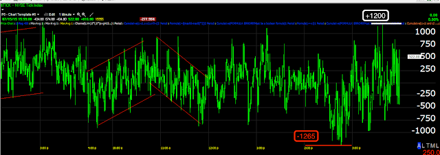 As for the intraday TICK today, as emotional as the market was feeling toward the end of the day, it didn't register any eye-opening extremes. The lowest TICK print was -1265 or so and then shortly after an upside print of +1200, while rare, we have seen these print extremes of 1600-2000.