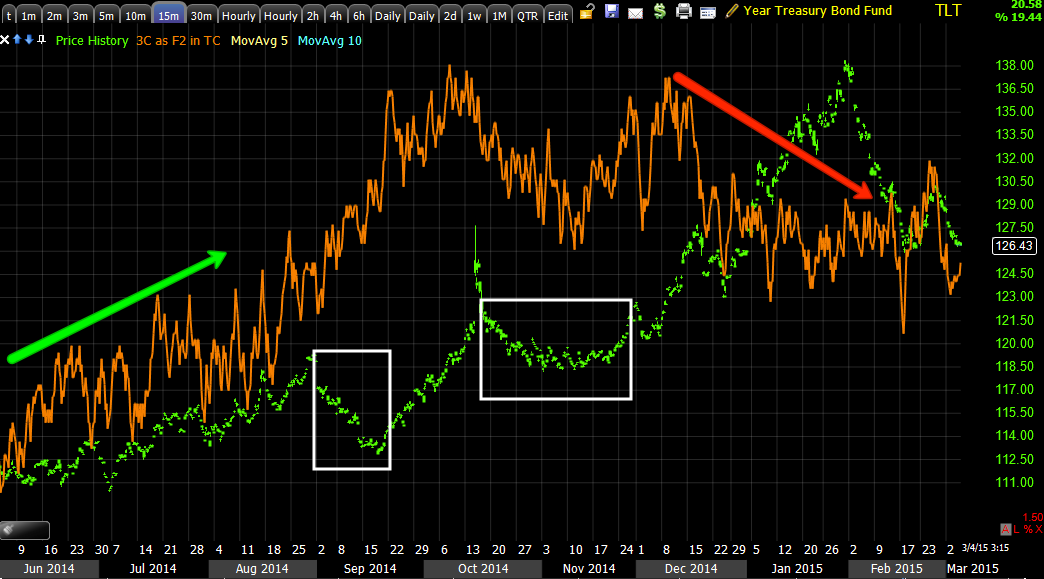 QQQ 15 min showing the overall trend since the start of the year which should be clear from left to right and individual divergences marked in red and white. The current move which targeted the 2015/January range as it was exceptionally obvious and thus predictable in how traders would react (see the gap at the orange arrow above the range) has seen exactly the divergence I expected to see once we identified the base from Jan 29th to Feb. 2nd and identified the obvious range that would be the subject of the move.