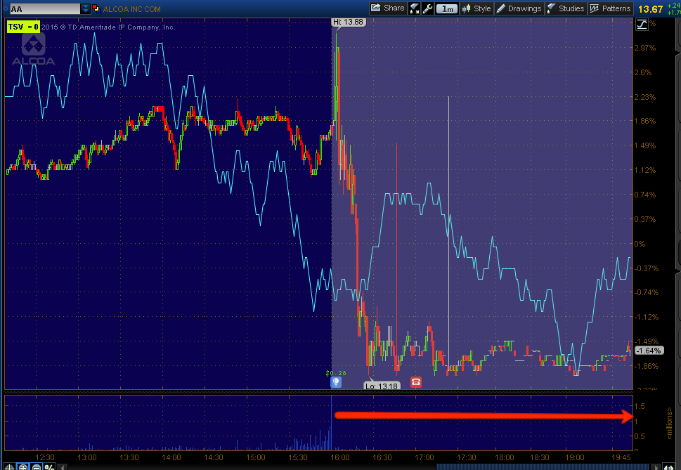 Alcoa (AA) regular hours and after hours as they report earnings.