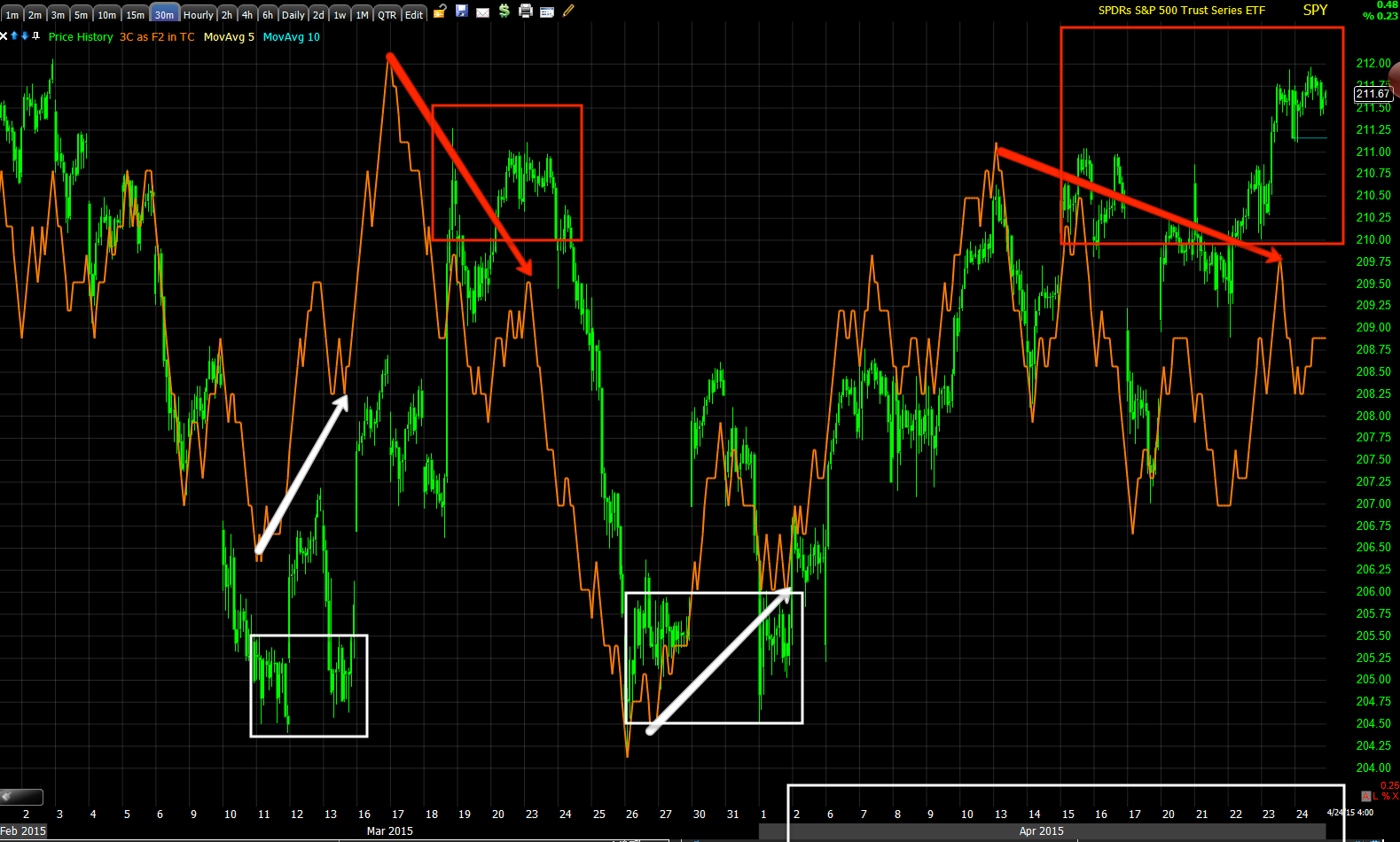 SPY with the April 2nd forecast and trend since in white on the time axis with 3C showing a large negative divergence. Note the positive divergence going in to early April like our Leading Indicator above showed at the exact same "W" bottom.